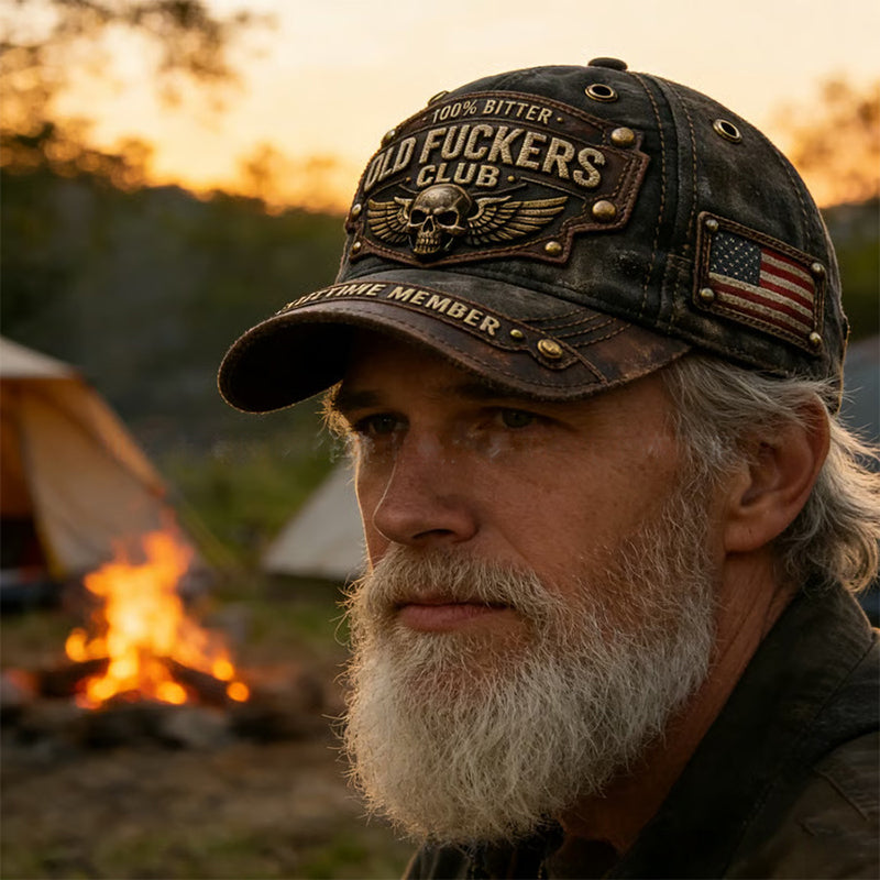 Здрава винтидж бродерия — Покажете своята принадлежност с нашивки с надписи „Old-School Club“, „100% Bitter“ и „Lifetime Member“. Тази шапка служи като знак на чест, празнуващ добре преживян живот с безкомпромисна здравина.